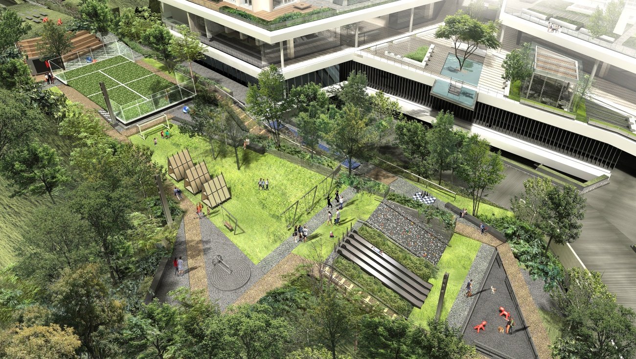 Zona zen, senderos, yoga, cine al aire libre, camping, dog park, juegos infantiles, ajedrez gigante.